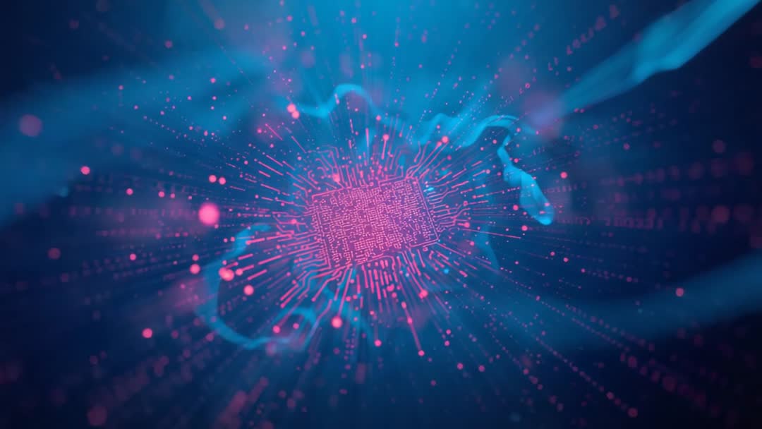 AI Generated Image. Footage showing neon magenta microchip core pulsing in deep cyan space, emitting radial circuitry traces and floating pink bokeh particles. Slow camera zoom and motion blur creating sense of depth and speed. Visual language fitting tech concepts such as AI compute, processor speed, quantum computing visualization, data transfer, and cybersecurity. Use for technology presentations, startup pitch decks, product launch trailers, website hero reels, broadcast motion graphics, music video overlays, exhibition displays, and VJ loops. Edit-friendly composition leaving negative space for titles and logos. Color grading and speed ramping enabling adaptation for corporate, entertainment, and sci-fi projects. Loop-friendly sequence supporting seamless background loops and transitions.