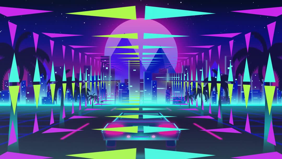 This visually striking video features a neon-lit corridor with futuristic vibes, displaying geometric shapes leading into a radiant magenta sun on the horizon. Set against a starry night sky, this scene utilizes vivid colors to transport the viewer into a fantastical world filled with digital aesthetics and retro elements. Ideal for use in sci-fi art compilations, digital wallpaper design, and media content related to futuristic, immersive environments.