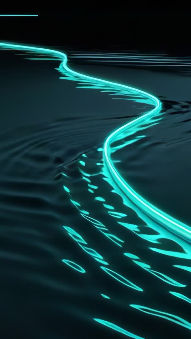 AI Generated Image. Vertical loop video featuring glowing cyan light trail tracing dark glossy surface and creating rippling wave patterns. Composed for vertical aspect ratio, showcasing high contrast neon-on-dark palette and fluid motion. Suitable for tech promos, cyberpunk visuals, electronic music visuals, app launches, social media stories, mobile wallpapers, title backgrounds. Use as looped background for Instagram Reels, TikTok ads, hero screens, or product demo reels; overlay text, logos, or UI elements for dynamic presentations. Combine with ambient or electronic sound for VJ sets, live visuals, brand intros, or promo videos. Easy to color grade and crop for different platforms; works well with minimal typography and bold call-to-action overlays.