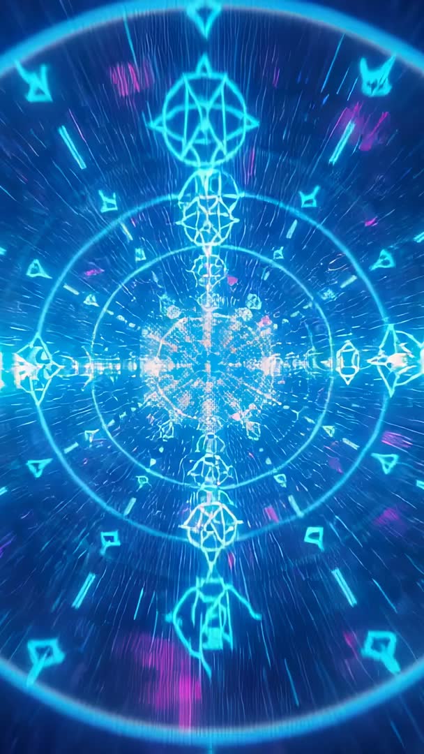 AI Generated Image. Showing forming 3D tunnel accelerating inward with rotating cyan geometric glyphs and streaking magenta lights. Featuring camera motion suggesting high speed warp toward glowing core. Serving as vertical video background for tech promos, app intros, futuristic title sequences, Instagram Reels, TikTok ads, VJ loops and music visuals. Offering loop-friendly composition when trimmed; supporting color grading and additive blending; providing clear overlay space for logo and title at center or top third. Suiting product launches, cyber security campaigns, gaming trailers, virtual event openers and UI demonstrations. Delivering energetic, immersive mood and modern neon palette for digital content creators, agencies and broadcasters.