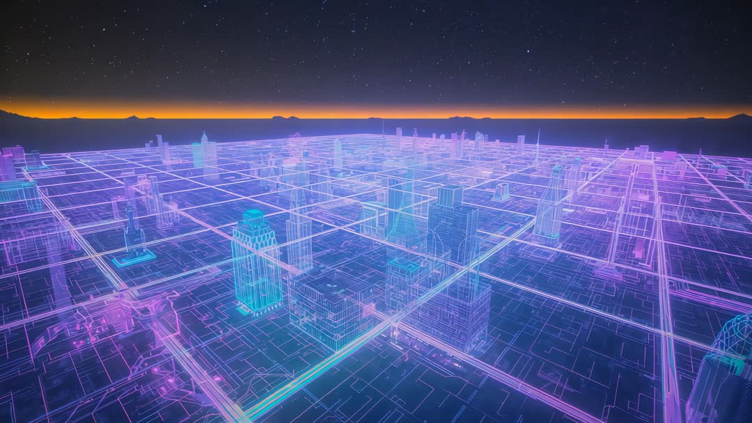 AI Generated Image. This visually captivating video frame depicts a futuristic cityscape made of neon wireframes and grids, illuminated against a starry night sky. The various skyscrapers and city grids emit vibrant blue and pink neon hues, giving a sense of a digital, cybernetic world. The virtual city resembles a holographic representation, ideal for projects related to technology, AI, science fiction themes, virtual reality environments, or showing concepts of futuristic innovation. This imagery serves perfectly for background scenes in video games, virtual showroom examples, or sci-fi movie concepts seeking a high-tech artistic feel.