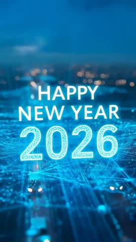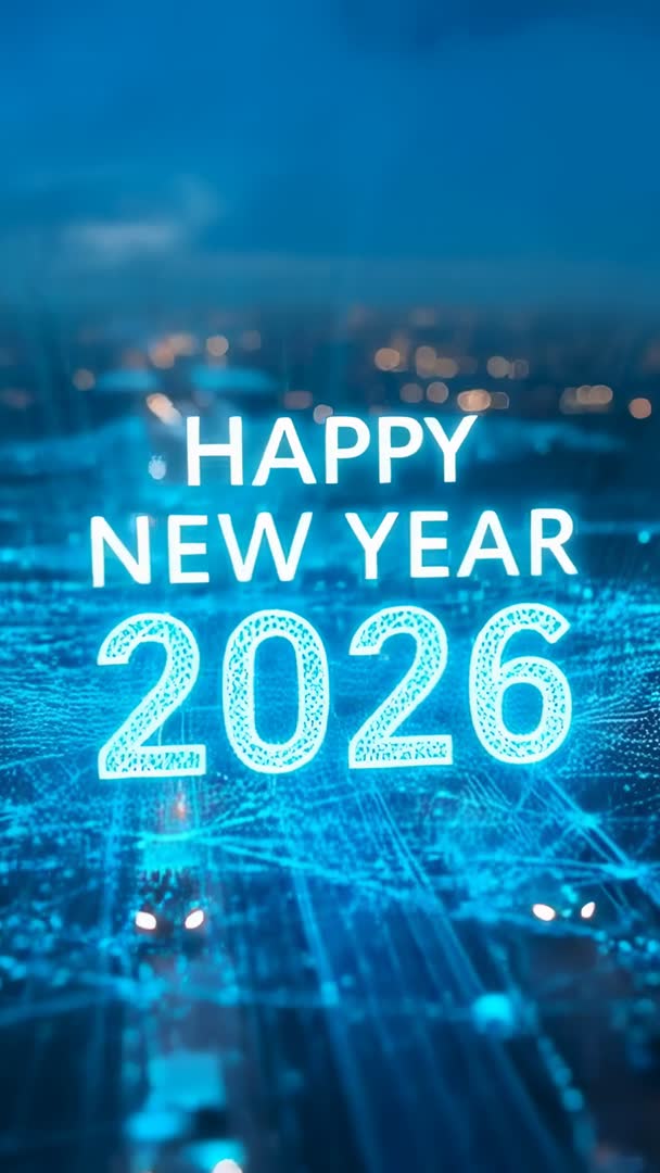 AI Generated Video. Featuring pulsing neon HAPPY NEW YEAR 2026 text hovering above moving digital grid and rain-slick urban road, with car headlights creating soft bokeh glow. Vertical 9:16 composition optimized for phone screens and social platforms, delivering cinematic cyberpunk mood in luminous blue tones and subtle camera parallax. Use for Instagram Reels, TikTok, YouTube Shorts, stories, vertical ads, countdown loops, event promos, club party promos, tech brand greetings, corporate holiday messages, livestream intros, digital signage, and background for New Year campaigns. Perfect for overlaying logo or text and looping for continuous display. Suggested edits include adjusting speed, color grading toward cyan or magenta, adding particle sparkles, and syncing motion to music for dynamic rhythm. Providing ready-to-edit layer for adding custom message or countdown numeric overlay.