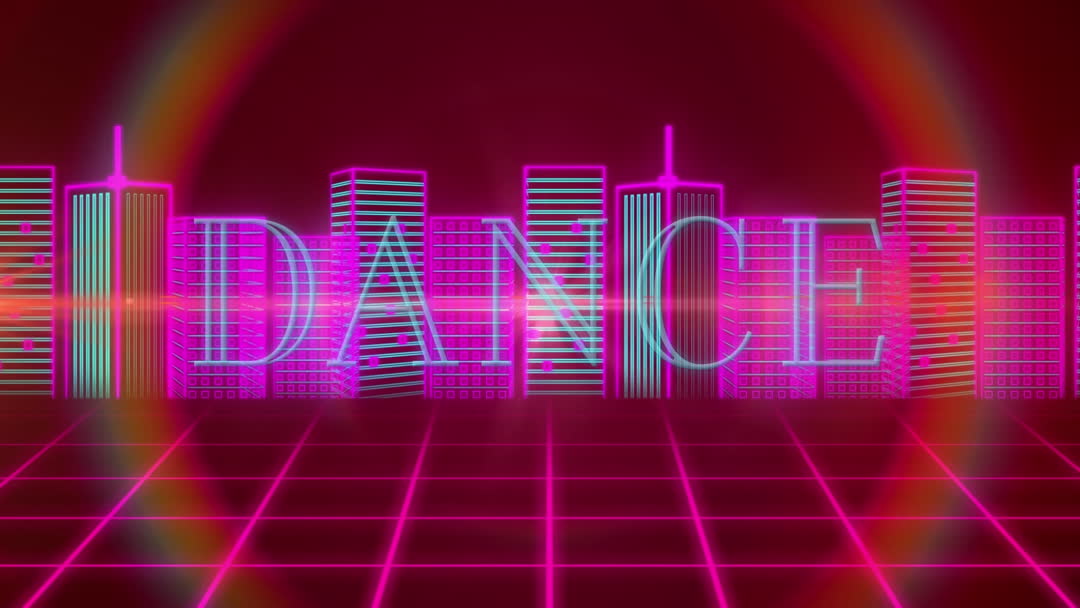 Neon skyline illuminated by vibrant colors with oversized dance text, evokes look of an 80s nightclub. Great background for digital content creators, enhances social media posts and music promotions, complements retro styles, plays with disco vibe.