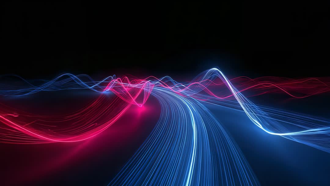 AI Generated Image. Neon blue and pink light streams racing toward horizon through dark void, pulsing and weaving into layered waveforms. High-speed ribbon of light creating sense of motion, speed, and digital connectivity. Perfect for tech promos, product launch videos, app intros, VJ loops, electronic music visuals, and broadcast openers. Working well as loopable motion background for website headers, streaming overlays, social media clips, conference presentations, and exhibition displays. Color palette and dynamic lines allowing easy overlay of logo, titles, and lower thirds while maintaining visual impact. Post-production suggestions: applying slow motion, subtle motion blur, color grading, and glow enhancements to amplify futuristic atmosphere.