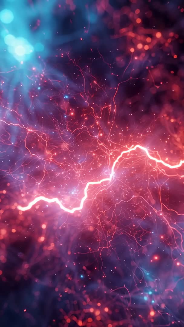 AI Generated Image. Video showing pulsing filament sending electric current along branching tendrils, creating red and blue sparks and drifting particles across deep space-like void. Abstract neon plasma and bokeh highlights producing high-contrast, cinematic energy flow with dynamic motion and glowing veins. Visual working well as animated background for tech presentations, sci-fi title sequences, app splash screens, music visualizers, and social media vertical ads. Loop-friendly composition allowing seamless repetition for long-form backgrounds and live visuals. Color grading and speed adjustments working well for mood shifts and brand customization. Deliverable fitting vertical aspect ratios for mobile storytelling, reels, and short-form content.