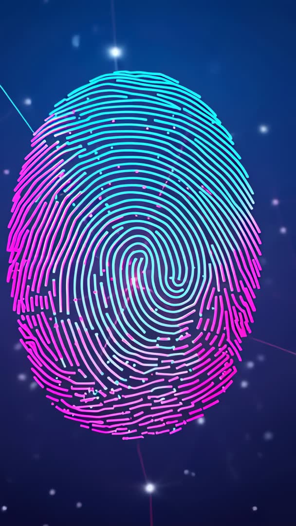AI Generated Image. Showing neon fingerprint pulsing at center with concentric cyan ridges and magenta accent dots over dark blue gradient background. Tiny particle sparks drifting while subtle scan lines sweep across ridges, creating readable digital scan motion. Clip designed for vertical video format and loopable playback, suiting mobile-first presentations and short social ads. Use for tech startup promo, mobile unlock demo, cybersecurity campaign, website hero banner, app intro, UI overlay, corporate presentation opener, or training module. Color palette emphasizing neon cyan and magenta for modern, high-tech look. Rendered with crisp lines and soft glow, optimizing for mobile screens and vertical feeds. Suggested edits: add text overlay or tagline, animate logo reveal at clip end, layer electronic pulse sound design, match cut to app interface or dashboard for seamless transition.
