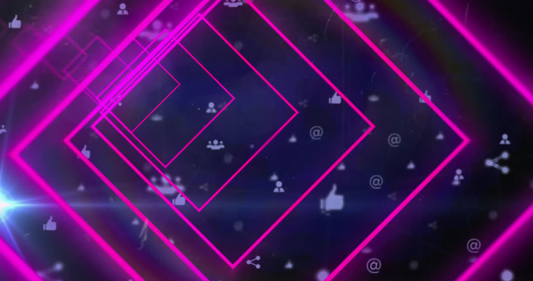A vibrant animation featuring neon geometric shapes overlaid with various social media icons in a digital interface context. This engages viewers with its modern and futuristic appeal, suitable for use in presentations, technology blogs, marketing materials, and digital design projects. Ideal for concepts portraying connectivity, innovation, and social networking.