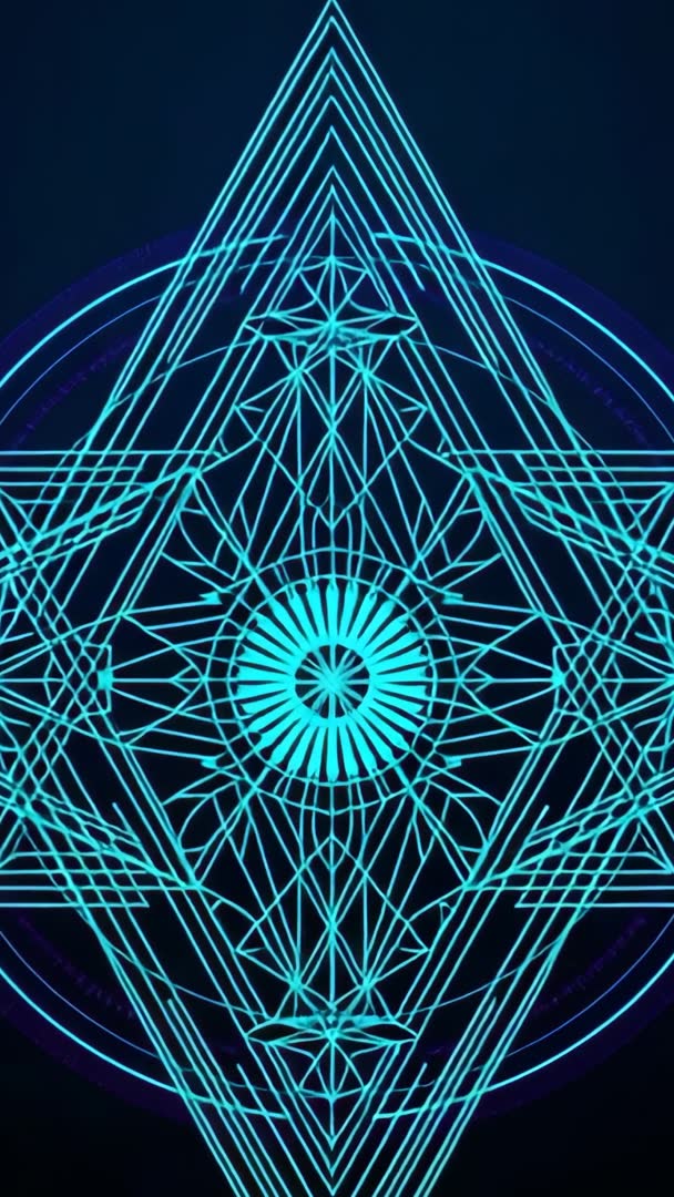 AI Generated Image. Opening on dark canvas with neon cyan lines animating outward into complex triangular lattice. Forming central radiant disc rotating and pulsing, creating symmetric mandala of precise geo lines. Exhibiting futuristic HUD aesthetics, neon glow, and subtle particle motion for depth. Rendering as vertical loop optimized for mobile screens and social stories. Serving tech promos, app intros, electronic music visualizers, event openers, meditation or ambient backgrounds, brand identity pieces, and VJ performances. Allowing overlay text in top and bottom safe zones. Advising loop editing for seamless repeat and subtle color grading to match brand palette. Delivering 10-30 second loop ideal for vertical ads, Instagram Reels, TikTok, and mobile app backgrounds.