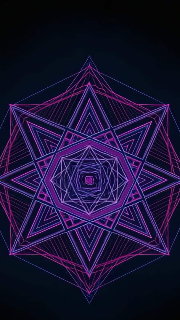 AI Generated Image. Showing neon geometric star pulsing and rotating in dark digital void, creating seamless looping animation optimized for vertical video. Featuring layered hexagon and star shapes, glowing pink and purple neon lines, and subtle motion trails that form hypnotic kaleidoscopic patterns. Working well for vertical background on social media stories, mobile ads, music visualizers, VJ sets, club displays, and livestream intros. Providing high-contrast visuals that support bold typography overlays, logo reveals, and call-to-action animations. Suggesting pairing with electronic or synthwave music, neon color grading, and minimal text for maximum impact. Delivering ready-to-use loop for continuous playback on mobile and tall screen formats.