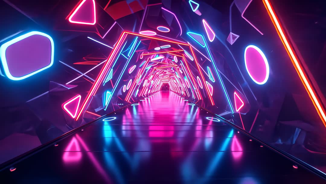AI Generated Image. High-energy neon tunnel video showing camera pushing forward through geometric LED frames and mirror floor reflections. Vibrant pink and cyan lights creating symmetrical glow and deep perspective toward vanishing point. Triangular and circular neon shapes lining walls while glossy walkway reflecting colors and forms. Camera movement providing immersive forward motion ideal for looping sequences and seamless transitions. Ideal for music video backgrounds, club visuals, sci-fi title sequences, tech product promos, event openers, website hero backgrounds, social media ads, stage visuals, VJ loops. Pairing with electronic music, overlaying text or logo animations, combining with particle effects, using as intro or interlude in livestreams or presentations. Looping-friendly composition enabling seamless repeat for long-form clips; color grading and speed ramping recommended for mood variation. Format notes: cinematic widescreen 16:9, forward push camera perspective, high-contrast neon palette, AI-generated digital art.