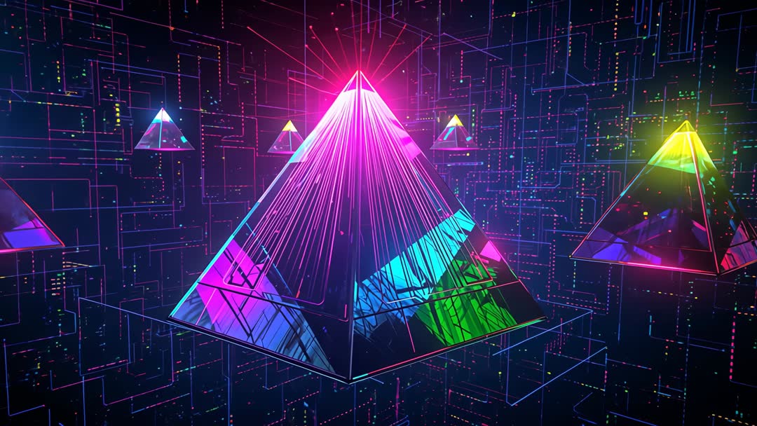 AI Generated Image. Video clip showcasing central glass pyramid rising, emitting cascading neon strands into surrounding digital grid. Multiple smaller pyramids floating across holographic cyberpunk space, circuits and data points pulsing in background. Vibrant magenta, cyan, green palette blending with reflective prism surfaces, creating iridescent, futuristic atmosphere. Clip offering loop-friendly composition, ideal for electronic music visuals, VJ performances, title sequences, technology product promos, blockchain and crypto campaigns, sci-fi trailers, and motion graphics projects. Usage suggestions: layering text overlays or logos onto darker grid areas, applying slow zoom or color grading variations for mood shifts, syncing light pulses to beats for music-driven edits. Suitable for social media clips, website hero backgrounds, event visuals, advertising spots, and NFT artwork promotion.