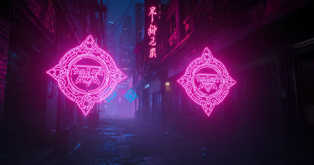 - Neon Glyphs Pulsating in a Futuristic Alley