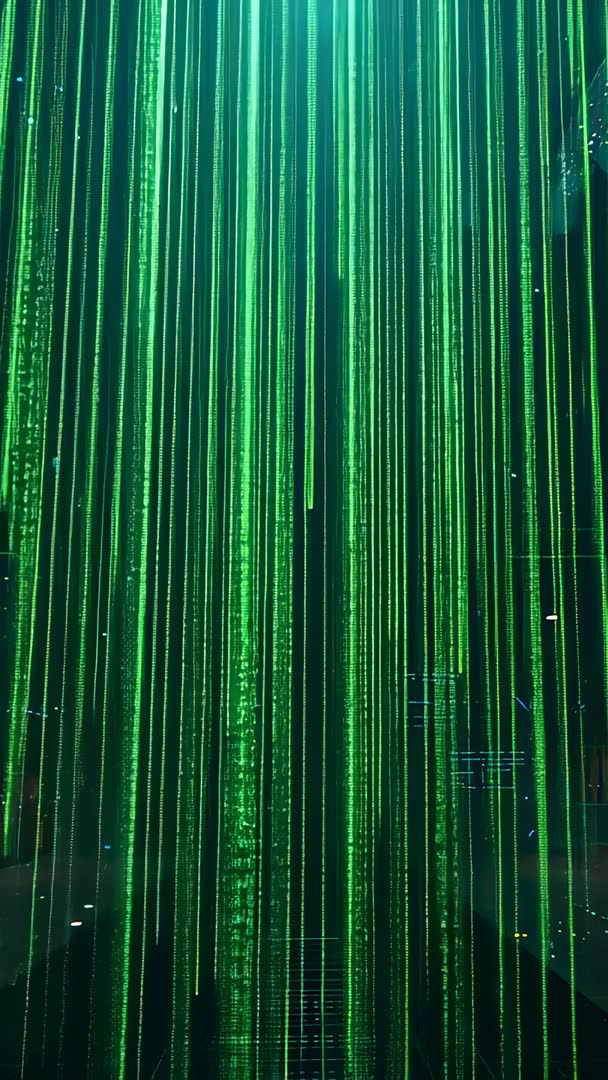 AI Generated Image. Vertical video showing neon green data streams streaming down virtual shaft and feeding holographic grid and layered steps. Visual combining digital rain, glowing glyphs, and fine matrix-like lines for immersive tech atmosphere. Color palette centering on green and black for high-contrast cyber look. Usage ideas: background for tech product demos, cybersecurity presentations, app and UI intros, music video visualizers, social media vertical ads, mobile wallpapers, broadcast lower-thirds, looping backdrop for trade show booths. File tips: making loop by matching start and end frames, adding subtle speed ramp for dramatic reveal, overlaying bold white or neon text for headline. Compatible with vertical aspect formats for smartphone and social stories.
