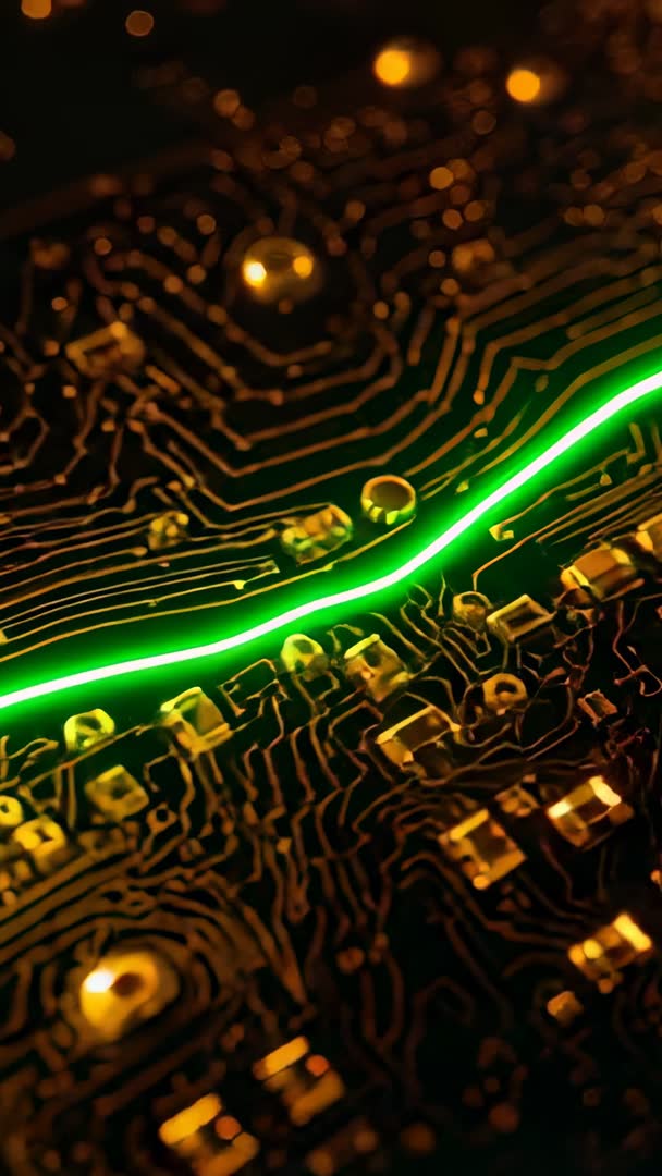 AI Generated Video. Highlighting neon-green trace traveling along intricate copper pathways on PCB while illuminating gold pads and surface components. Showing shallow depth of field and warm bokeh to emphasize reflective metallic textures and fine circuit details. Capturing dynamic motion in vertical format ideal for mobile-first presentations. Suggesting uses for tech product intros, startup or cybersecurity promos, app splash screens, social media stories and reels, backgrounds for presentations, website hero sections, and explainer videos about electronics or data flow. Recommending looped playback for ambient background, adding overlay text or UI elements for titles and call to action, and pairing with electronic ambient music for modern, futuristic mood.