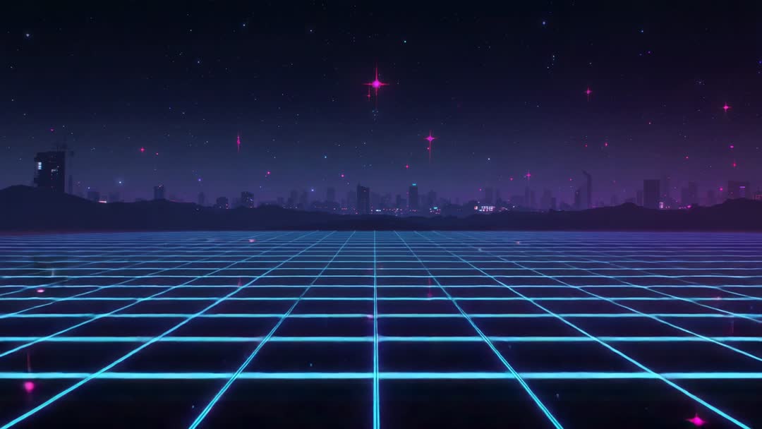 AI Generated Image. Featuring glowing cyan grid plane receding toward distant neon cityscape under starry violet sky with scattered pink star flares and subtle shimmer. Loopable clip showing smooth forward perspective with strong vanishing point, high-contrast neon palette, and stylized retrofuturist mood. Working well for music video backgrounds, livestream overlays, VJ visuals, title intros, and promotional reels for synthwave events or tech brands. Pairing with retro synth audio and animated typography for cinematic openings, social media clips, and Twitch or YouTube streams. Delivering usable footage for looping backgrounds in presentations, website hero sections, conference visuals, and product launch videos. Editable color grading and speed adjustments suggested to match project tone and brand palette.