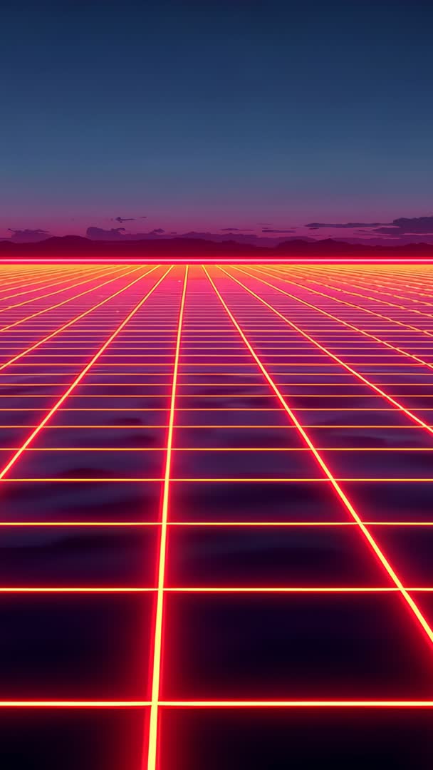AI Generated Video. Vertical video showing neon grid glowing across endless plain toward distant horizon, colors shifting from magenta to deep blue. Looping footage serving as mobile wallpaper, social media backdrop, music visualizer background, VJ projection, and streaming overlay. Perfect for retro-futuristic campaigns, 80s synthwave promotions, club visuals, title intros, product ads, and app launches. High-contrast neon lines creating strong vanishing point and deep sense of depth, supporting cinematic transitions and motion graphics. Delivered in vertical format optimized for stories and reels, enabling seamless loop and easy integration into shorts and vertical campaigns.
