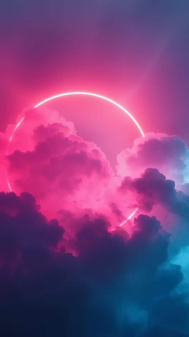 AI Generated Image. Vertical loop showing neon ring rising through pastel magenta and cyan clouds, glowing with soft radiance. Serving well for mobile backgrounds, social vertical video ads, Instagram Reels, TikTok clips, music video intros, cinematic title sequences, app splash screens, meditation visualizers. Looping composition allowing seamless repeats and text overlays, leaving negative space at top for headlines and lower third graphics. Color palette featuring neon magenta, electric cyan, deep indigo, creating dreamy futuristic mood with high contrast highlights. Delivery notes: 9:16 aspect ratio, vertical orientation, high-resolution source suitable for mobile-first projects and digital signage. Editing tips: applying soft grain and film glow, using screen blend for neon ring, adjusting hue for brand alignment. Usage ideas: hero backgrounds for landing pages, promotional reels, EDM event visuals, title slates, on-boarding screens, mood-setting interstitials. Layering logos and kinetic text recommended, keeping contrast for legibility against bright neon areas.