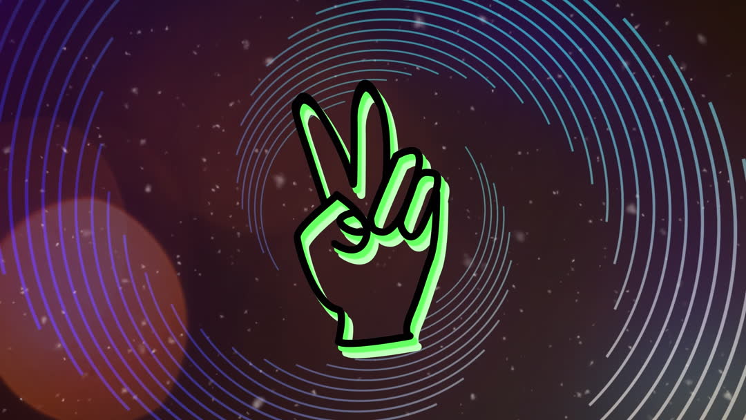 Dynamic animation featuring a vivid neon hand making a peace sign surrounded by hypnotic spinning light trails. The design includes subtle falling dust particles, enhancing the ethereal effect. This captivating animation can be used for social media headers, video backgrounds, or as a unique introduction for creative digital content projects, focusing on themes of peace, transformation, and connectivity.