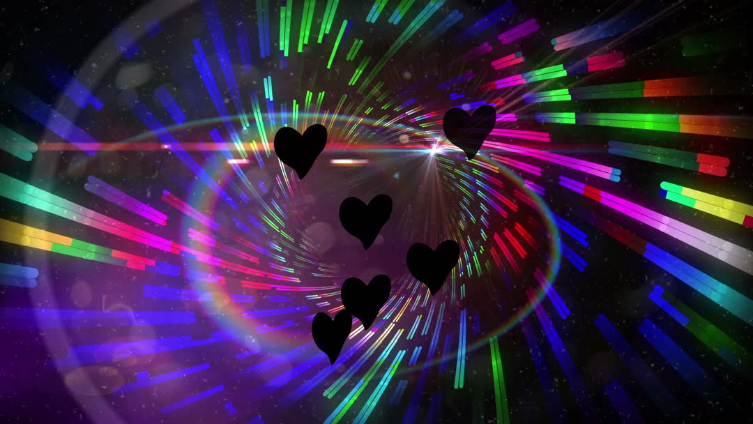 This animation features black hearts seamlessly integrated over a colorful and vividly swirled background that radiates a sense of excitement and motion. The varied neon shades create a hypnotic visual appealing in digital designs. Perfect for use in backgrounds, posters, or digital multimedia projects focusing on themes of vibrancy or animated display designs.