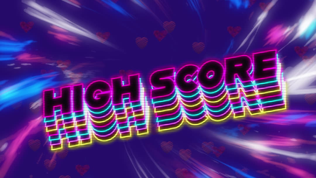 This vibrant animation features 'High Score' text in neon tones against a dynamic blue background, evoking nostalgic retro gaming aesthetics with colorful trails and heart motifs. Perfect for gaming blogs, social media advertisements, video intros, or content related to digital communication and retro digital elements.