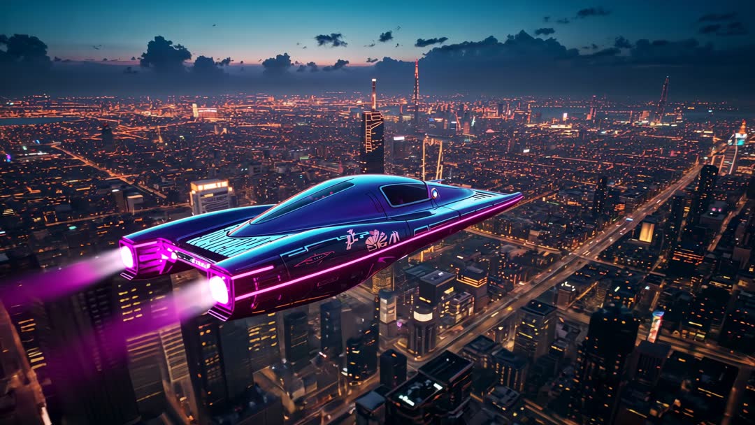 AI Generated Video. Featuring neon hovercraft gliding above sprawling metropolis at dusk, highlighting glowing pink thrusters and illuminated skyline. Showing sweeping aerial perspective with deep twilight tones and dense urban grid of lights. Suiting use for sci-fi film sequences, technology commercials, game trailers, book covers, website hero banners, editorial pieces about urban mobility and future transport. Allowing easy cropping for widescreen formats and layering for motion graphics or title sequences. Providing space for overlay text and branding against dark sky and horizon.