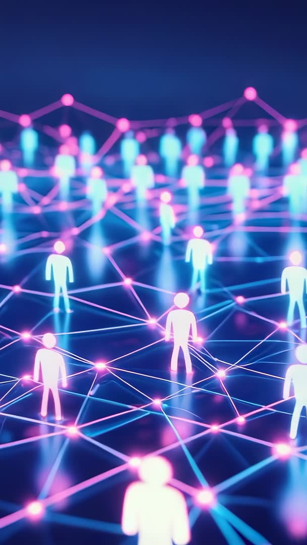 AI Generated Image. Vertical video showing neon humanoid icons forming expanding node network across glowing cyber grid. Pink and blue pulses connecting icons highlighting data flow, connectivity, virtual community. Scene working well for tech product demos, app intros, blockchain and AI marketing, cybersecurity presentations, startup pitch videos. Use as mobile ad background, social media story, website hero video, trade show loop, or onboarding animation. Loopable motion and strong contrast supporting overlay text and logo placement. Color palette neon blue and pink providing modern futuristic mood, ideal for branding related to network, data, communications, and remote collaboration.