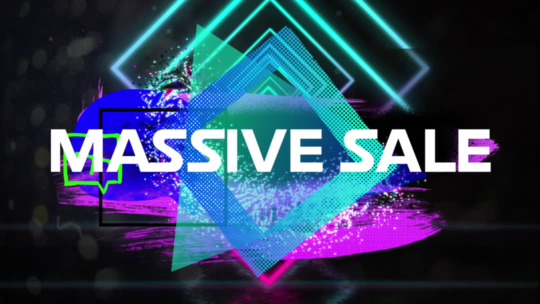 This vibrant design features neon geometrical shapes and bold white text announcing a massive sale, creating an eye-catching digital promotion template. Suitable for retail events, online marketing campaigns, social media advertisements and digital products promotions, this engaging visual captures attention with its modern, tech-inspired look.