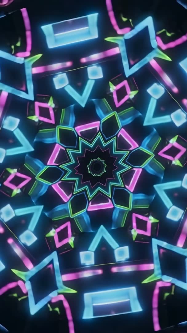 - Neon Kaleidoscope Tunnel Rotating Mandala Looping Vertical Video Background Pulsing Stars