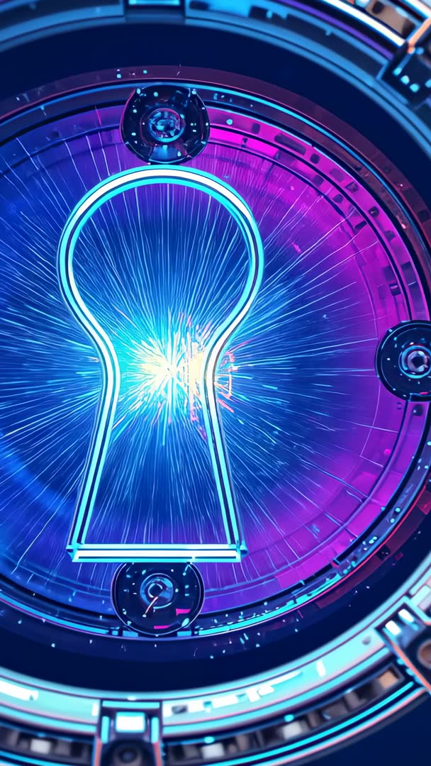 AI Generated Image. Vertical 9:16 cyber video featuring neon keyhole pulsing at center of rotating metallic vault ring, radial light rays sparking outward. High-contrast blue and magenta palette creating futuristic, mysterious mood. Ideal for cybersecurity intros, data protection promos, tech conference openers, app UI transitions, product reveal videos, streaming overlays. Loopable animation working well for backgrounds, social media stories, mobile adverts. Suggested edits: adding logo reveal inside keyhole, syncing light bursts to audio beats, applying slow zoom for dramatic emphasis. Delivery recommendations: exporting 4K vertical, including alpha channel option for overlays, providing seamless loop file.