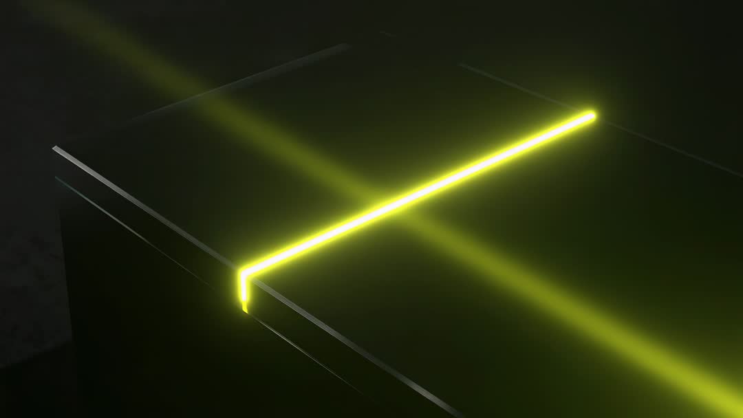 - Neon L-Corner Beam Animating Across Matte Black Slab, Futuristic Yellow Glow Loop