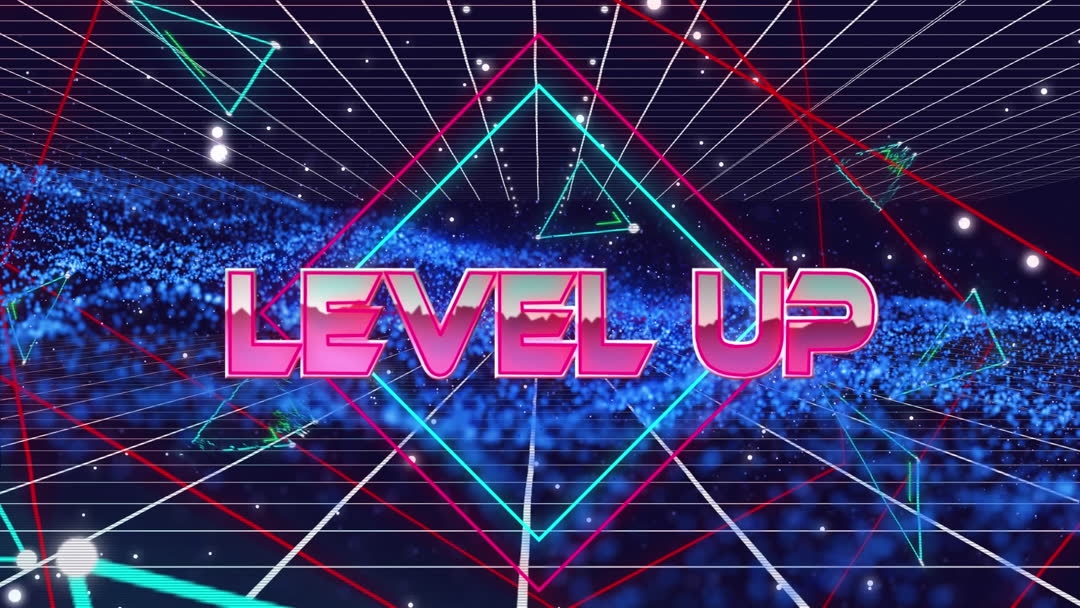 Conceptual artwork featuring vibrant neon-colored 'Level Up' text placed on a futuristic and digital metaverse grid background. Suitable for representing themes and concepts related to gaming, leveling up in video games, virtual realities, and retro digital graphics. Ideal for video game promotions, branding, posters, or interface designs featuring nostalgic themes combined with modern virtual reality concepts.