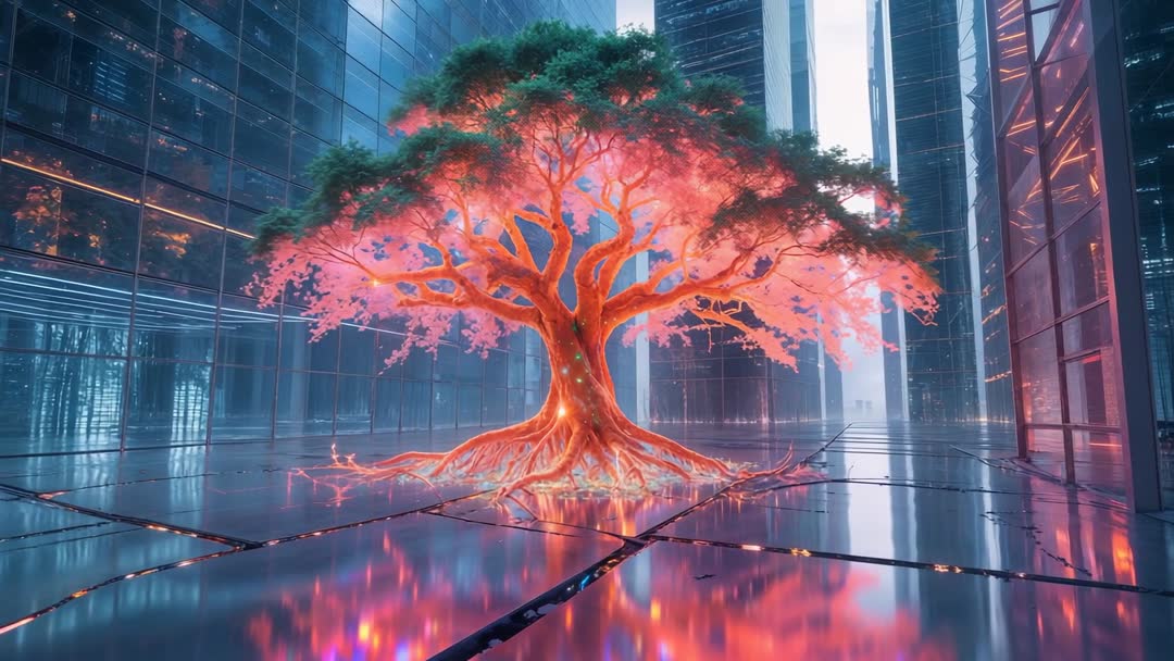 Neon-Lit Bioluminescent Tree in Futuristic Atrium Video