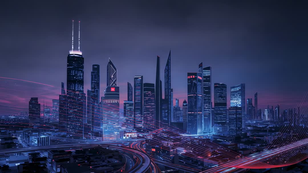 AI Generated Image. Showing panoramic aerial view of neon-lit metropolis at dusk, twin-spire tower glowing while traffic leaving long neon light trails along elevated ramps. Featuring cool blue and magenta palette, reflective glass facades, and cinematic depth with layered foreground highways. Offering high-resolution 4K footage for looping backgrounds, tech product launches, smart city campaigns, urban mobility presentations, sci-fi film openers, corporate annual reports, and editorial features on future cities. Working well with slow pan or subtle zoom, overlaying logo in lower-left or center-right safe area, and adding motion blur or color grading for stronger mood. Providing abundant negative space and high-contrast composition for title treatment, lower thirds, or promotional text. Mood conveying futuristic, energetic, visionary, and high-tech urban lifestyle.