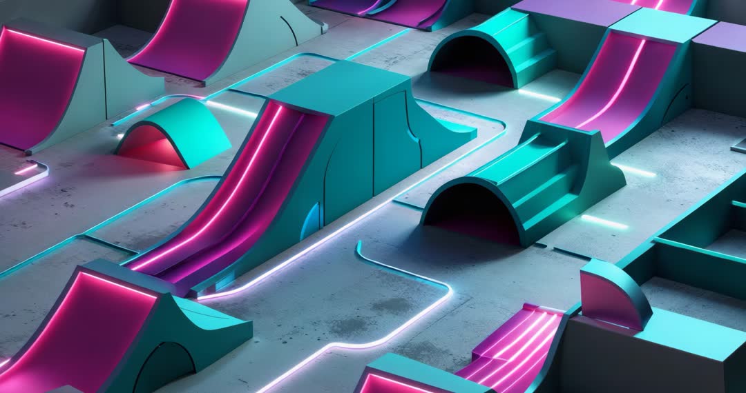 - Neon-Lit Modular Skate Ramps Vibrant Geometric Scene