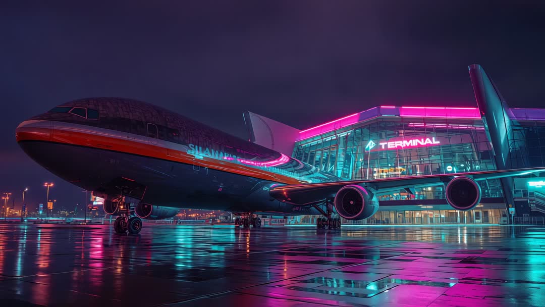 AI Generated Image. Nighttime video clip showing neon-lit widebody jet parked alongside glass terminal, wet tarmac reflecting teal and magenta lights. Camera holding low-angle wide shot, emphasizing aircraft nose, jet engines, and landing gear while terminal signage and interior lighting glowing. Rain-slick apron creating mirror-like reflections, adding cinematic mood and depth with moody sky and ambient ramp lights. Ideal for use in aviation marketing, airline branding, travel promos, corporate presentations, website hero backgrounds, film opening sequences, and technology or cyberpunk themed projects. Clip working well as looping background for social ads, title card backdrop for video productions, or stock footage for documentaries and news segments about airports, nighttime operations, or aircraft ground handling. Suggested post-production moves: color grade toward teal and magenta, apply subtle camera dolly or glide for reveal, add ambient runway SFX and soft engine rumble for immersive sound design. Resolution and framing matching widescreen broadcast and online video requirements, suitable for motion graphics and cinematic edits.