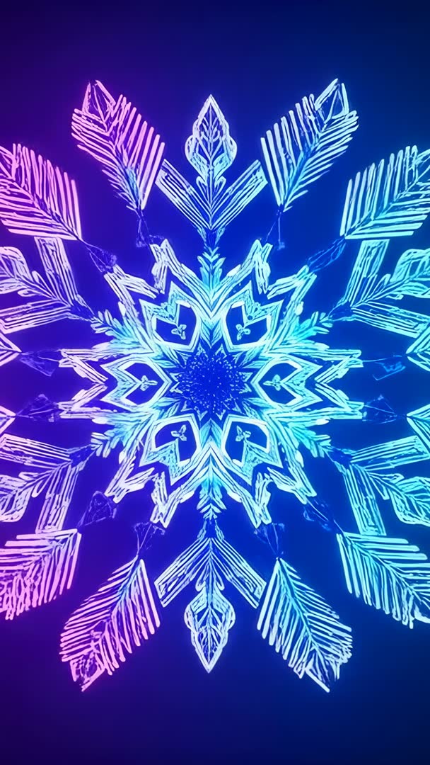AI Generated Video. Featuring neon mandala snowflake rotating and expanding on dark backdrop, revealing layered radial motifs in cyan and magenta gradient. High-contrast glowing lines and symmetrical geometry creating hypnotic kaleidoscope effect. Vertical 9:16 composition optimized for mobile and social stories. Looping motion working well for music visualizers, VJ sets, live streams, club projections, and background visuals for videos. Serving as eye-catching element for holiday and winter campaigns, party promotions, meditation and relaxation apps, and mobile wallpapers. Color grading and speed adjustments pairing easily with branding overlays, title intros, and product promo sequences.