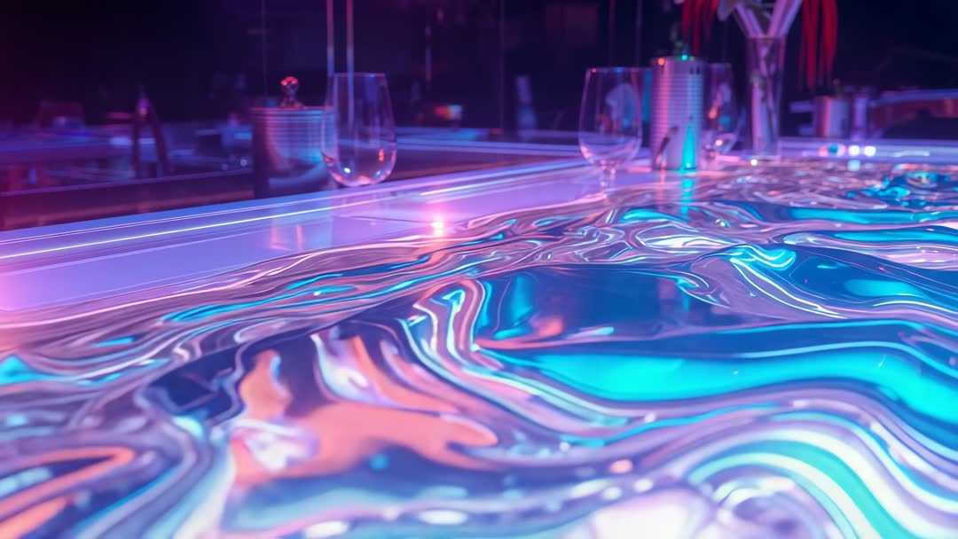 AI Generated Image. Short video showing close-up camera push over neon-lit marbled epoxy resin bar surface, shimmering with iridescent teal, magenta and purple highlights. Glassware and ice bucket sitting in soft focus along rear edge, adding depth and context. Fluid metallic ripples reacting to light, creating cinematic motion and reflective highlights. Clip working well for nightlife promos, cocktail bar branding, music video backgrounds, social media ads, title screens, VJ loops, product reveals, interior design mood boards. Editing suggestions: using slow motion or subtle speed ramping for dramatic effect, adding grain and lens flare for cinematic look, cropping for hero banner or looping seamlessly for moving background.