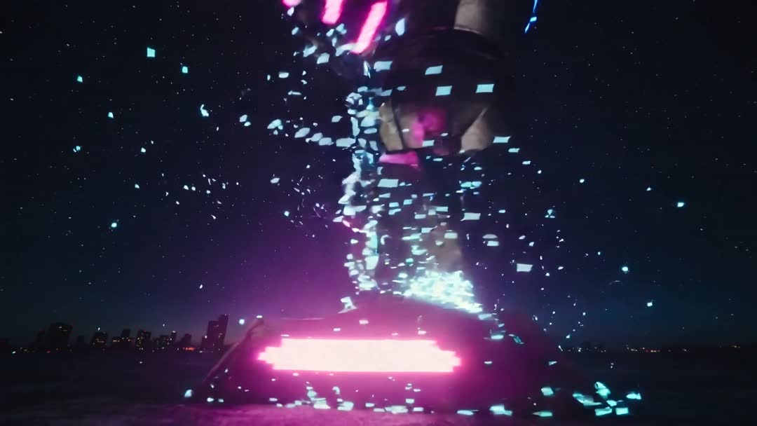 Neon mech assembling from CRT pixels near city skyline during arcade cabinet boot-up Video