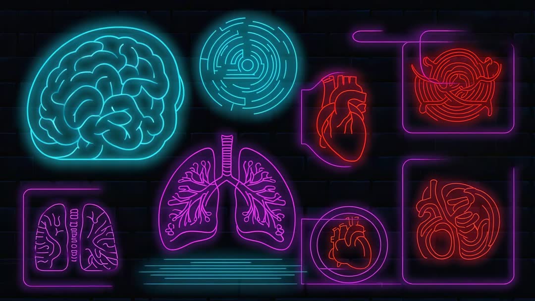 AI Generated Video. Neon medical icons including brain, lungs, heart, and intestines are creatively pulsing against a brick wall background, evoking a sense of future healthcare and digital innovation. This concept could be used in technology, AI healthcare projects, educational materials highlighting human anatomy, or medical software interfaces thriving on modern graphics. Captures attention with its glow, ideal for presentations, posters, or marketing campaigns in medical fields.