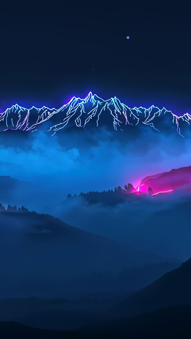 AI Generated Video. Featuring neon-outlined mountain ridge glowing above magenta-lit valley. Showing thick fog rolling through layered silhouettes, creating depth and mystery. Using deep blue and magenta palette for futuristic, cyberpunk mood. Including distant star adding subtle cosmic accent. Ideal for backgrounds in music videos, app wallpapers, meditation and sleep apps, sci-fi trailers, motion graphic intros, social media vertical content, YouTube Shorts, Instagram Reels, TikTok. Pairing with synthwave soundtrack, neon typography, slow parallax or pan for dramatic reveal. Providing loopable ambient clip or hero scene for branding campaigns, event promos, tech product reveals, and digital wallpaper collections. Delivering bold color contrast and moody atmosphere for futuristic or nocturnal storytelling.