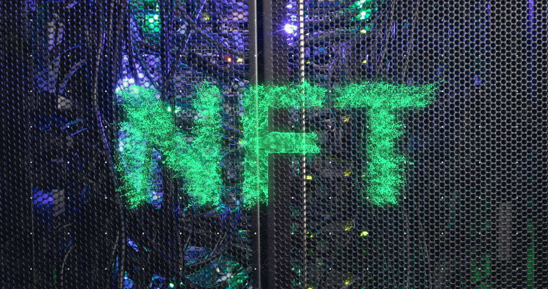 Digital grid background with glowing neon NFT text suggesting modern technology and blockchain concepts. Ideal for use in cryptocurrency-related content, articles on digital assets, or educational materials on financial technology.