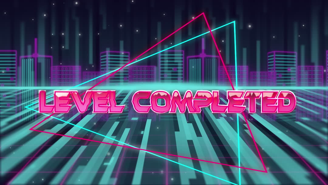 Dynamic animation with glowing futuristic neon graphics expressing a player has completed a gaming level in a digital universe. The vibrant colors and geometric designs give a retro yet modern touch, perfect for video game celebrations, gamer communities, or entertainment-themed communication visuals.