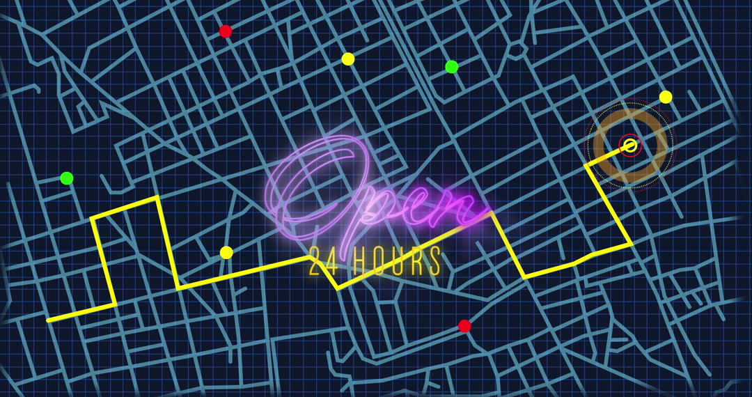 Glowing neon text displays open hours overlaid on digital navigation map, suggesting accessibility and round-the-clock service. Suitable for businesses emphasizing 24/7 operation, sustainable locations, or digital navigation themes.