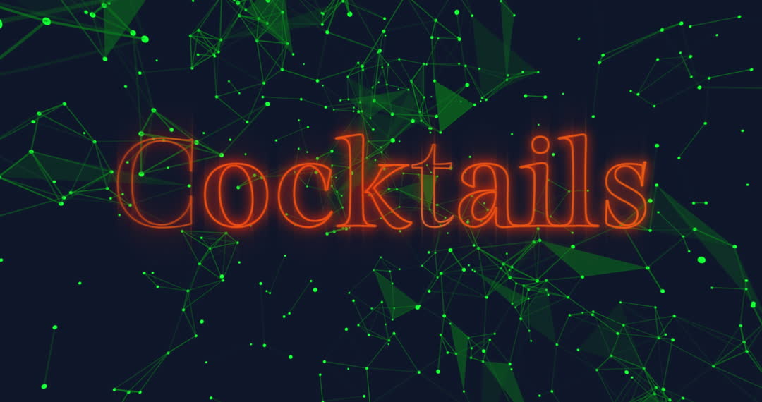 This graphic features a neon orange 'Cocktails' sign set against a dynamic green plexus network background. Perfect for use in marketing materials for bars or events, digital promotions, and website design elements related to nightlife or beverage services.