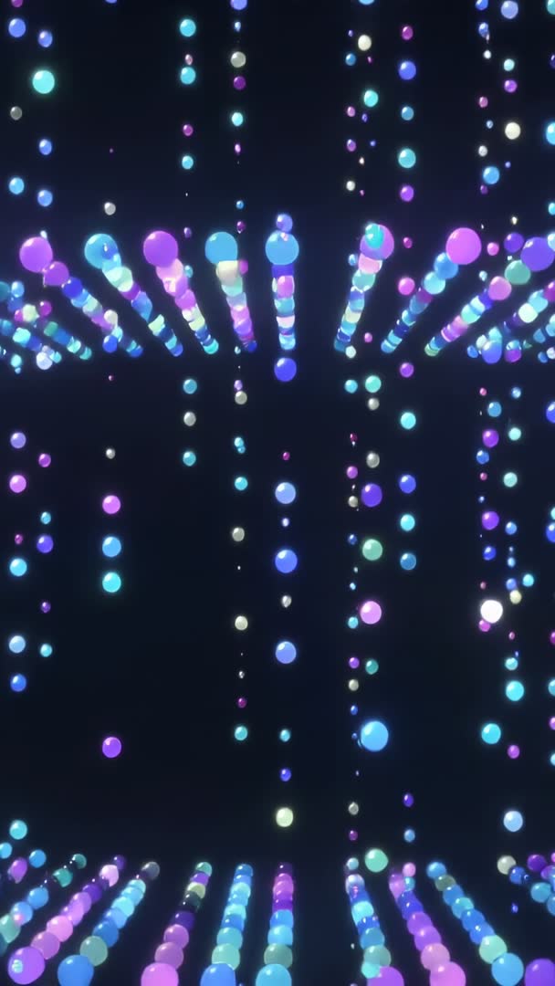 AI Generated Image. Vertical abstract video showing neon orbs forming matrix of vertical columns and converging into central circular portal. Orbs glowing in blue, purple and teal hues while pulsing and traveling along depth grid, creating immersive sense of motion and spatial depth. Composition offering high-contrast dark void background for strong glow and clear overlay readability. Ideal for tech promo, electronic music visuals, app intro, social stories, mobile ads, event projection and VJ loops. Suggested uses include background for title screens, motion graphic transitions, product reveal animations, stage LED panels, VR environment elements and mobile wallpapers.