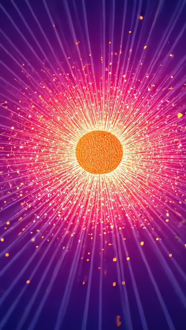 AI Generated Image. Vertical motion clip showing glowing orange core pulsating while pink filaments radiating outward across purple ribs. Gold particle fragments drifting and falling through radial field, creating kinetic sparkle and depth. Neon color palette combining warm core and cool purple background for high-contrast visual drama. Ideal for social vertical content such as Instagram Stories, TikTok clips, mobile ads, and app splash screens. Loopable 9:16 MP4 performing well as background for music promos, event openers, VJ loops, title slates, and science or space concept visuals. Text and logo placement working best in upper or lower third to preserve central motion. Color grading and speed adjustments compatible with creative edits and soundtrack synchronization.