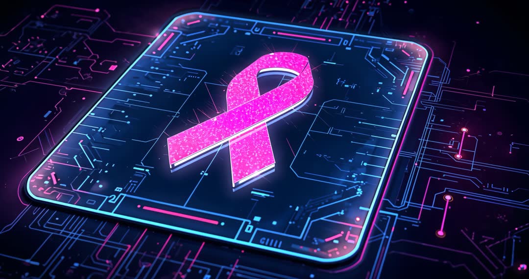 - Neon Pink Ribbon Rising from Futuristic Circuit Board