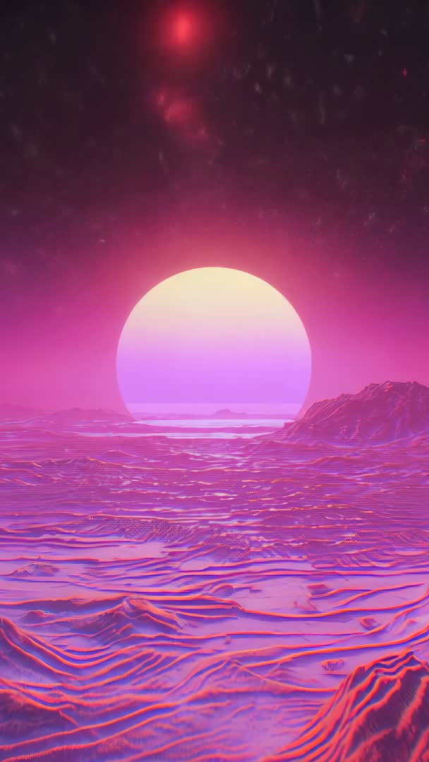 Neon-Pink Sun Descending Over Alien Shoreline Vertical Sci-Fi Sunset Loop Video
