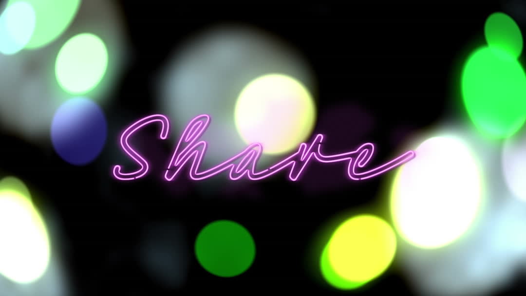 Neon 'Share' text glowing prominently against a dark background with softly blurred colorful light spots, ideal for projects related to social media communication, digital marketing, or technology advertisements. Perfect for backgrounds, presentations, and websites emphasizing connectivity and online interactions.