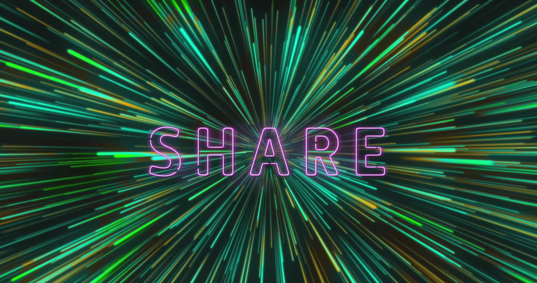 Bright and dynamic representation of communication and connectivity. Purple neon 'share' text stands out against animated green trails, reflecting technological and futuristic themes. Ideal for social media posts, digital sharing concepts, online networking campaigns, technology blogs, and business presentations emphasizing communication.